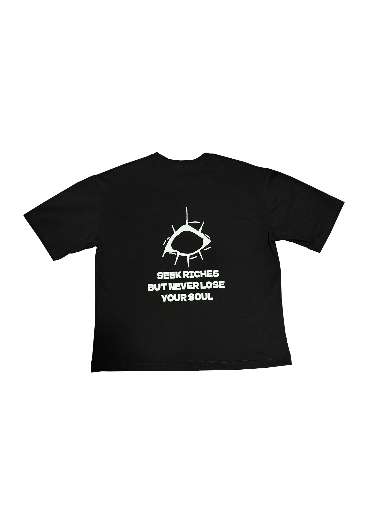 Un tricou negru, fabricat din bumbac de calitate, cu croială unisex lejeră și guler rotund, perfect pentru confort zilnic.