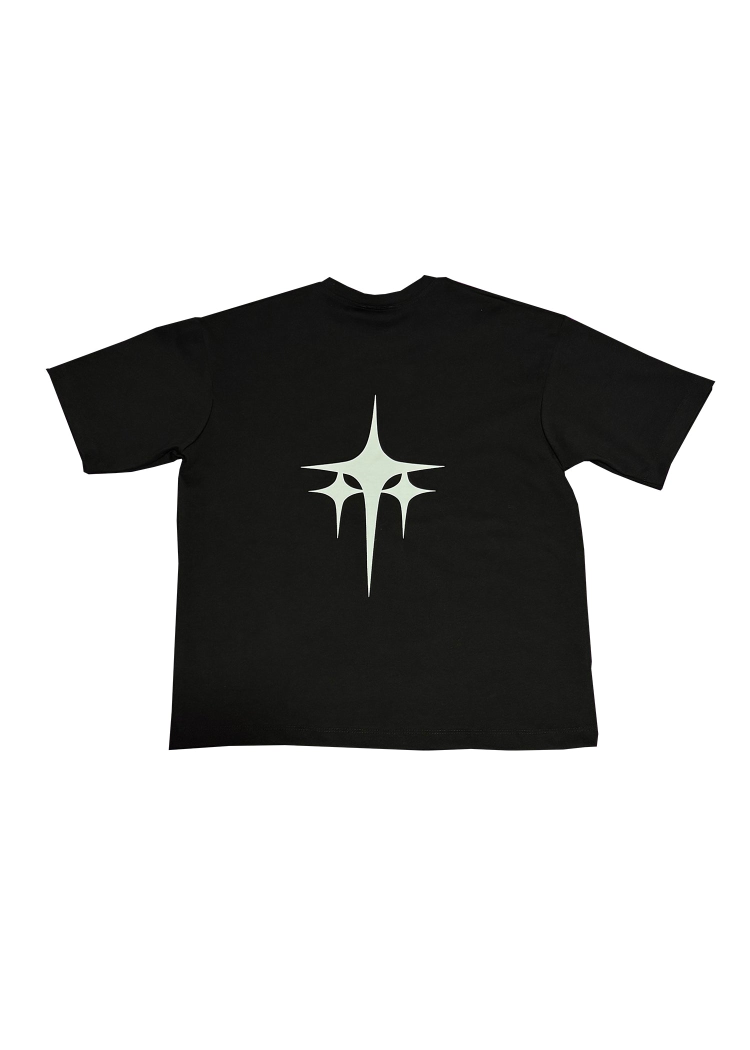 Un tricou negru, fabricat din bumbac de calitate, cu croială unisex lejeră și guler rotund, perfect pentru confort zilnic.